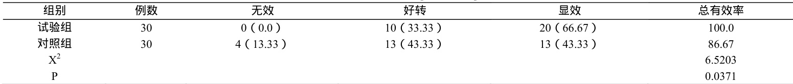 表 1 内的总有效率:试验组的计算结果优于对照组( 100.0% vs 86.67% , P<0.05 )。
