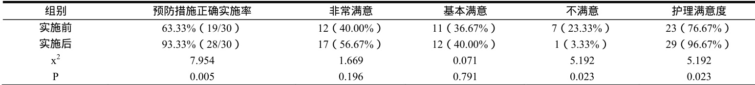 表1 预防措施正确实施率、护理满意度对比( ⋅n=30,%)