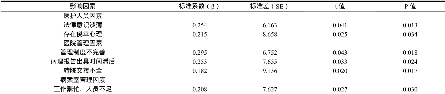 医院在病案资料管理方面存在制度不完善的问题。医院规定在患者出院后,需在 5 日内提交各类资料,并审查归档。但是,部分病理报告出具时间滞后,导致流程不畅通,导致医疗文书缺失。同时,在医疗文书提交方面,相关人员责任并不明确,导致相关科室医疗人员容易出现松懈心理,也影响了医疗文书归档的及时性和完整性。此外,在科室交接方面规定不完善,导致患者转科治疗时病历流转、交接不全,对病案资料完整性也造成了影响。在本次研究中,管理制度不完善、病理报告出具时间滞后、转院交接全的标准系数分别为0.295、0.253、0.182,有统计学意义( P<0.05)