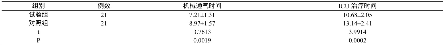 表1 内各组的机械通气和ICU 治疗时间:试验组短于对照组( P<0.05)