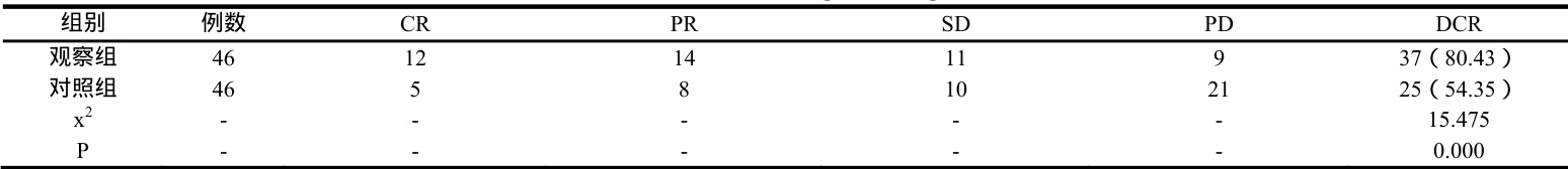 (1)于疗程结束后参照实体瘤疗效标准对两组评价,包括CR、PR、SD、PD,疾病控制率(DCR)为前3 项例数之和/总例数 ×100.00‰