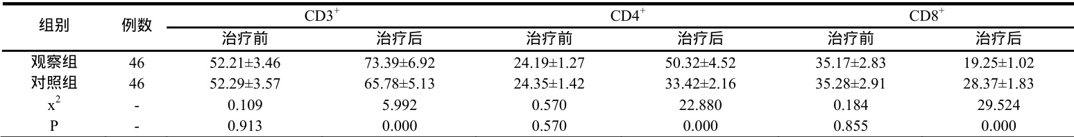 治疗前,观察组各免疫功能指标比较,不具显著差异( P>0.05 ),干预后,观察组 CD3+ 、 CD4+ 更高、 CD8+ 更低( P<0.05 ),见表 2