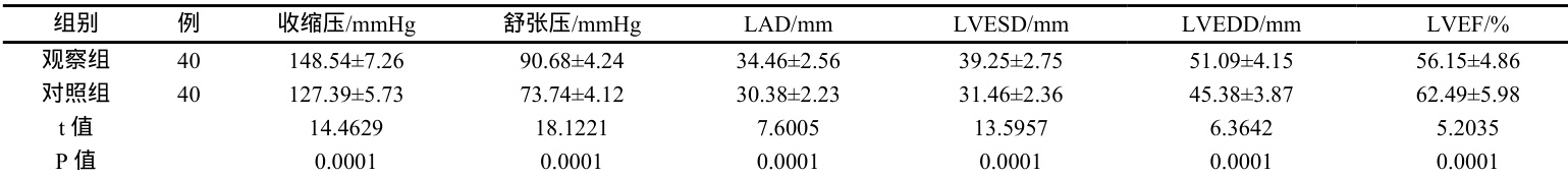 在本研究中,选取 2023 年 8 月至 2025 年 8 月期间我院接收的高血压左室肥厚伴左心力衰竭患者 40 例作为观察组。同期选取健康体检者 40 例作为对照组。观察组患者中分为男 22 例,女 18 例,年龄均值( 54.50±2.2 0)岁。对照组体检者中分为男 23 例,女 17 例,平均年龄( 54.00±2.10 )岁。两组一般资料对比无显著差异, P<0.05 ,具有可比性。