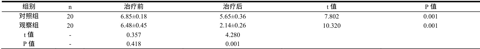治疗前两组比较VAS 评分,差异无统计学意义( P>0.05 );治疗后,两组V评分均低于治疗前,观察组明显低于对照组( P<0.05 ),见表 1 。