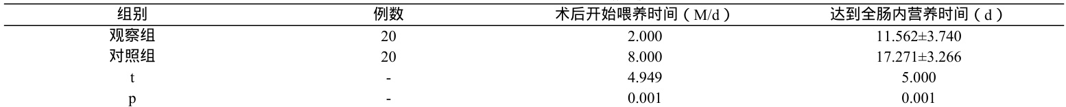 观察两组患儿术后开始喂养时间、达到全肠内营养时间,以及术后 7日营养情况。