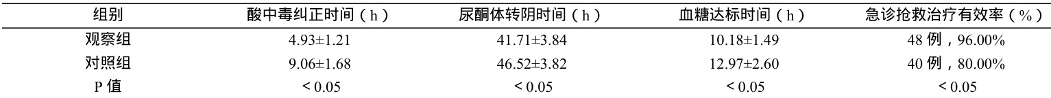 表1 比较两组酸中毒纠正时间、尿酮体转阴时间、血糖达标时间以及急诊抢救治疗效果(