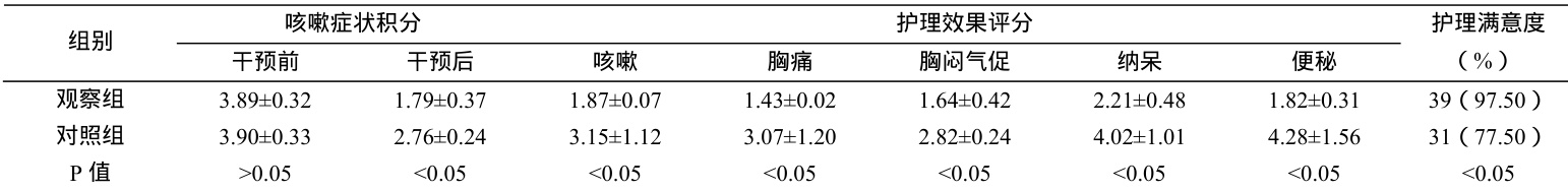 比较两组患者干预前后咳嗽症状积分(涉及日间、夜间咳嗽症状、日常活动受限等方面,分值高显示症状严重)、护理效果(包括:咳嗽、胸痛、胸闷气促、纳呆、便秘等症状改善情况,分值低显示护理效果优)以及护理满意度情况。