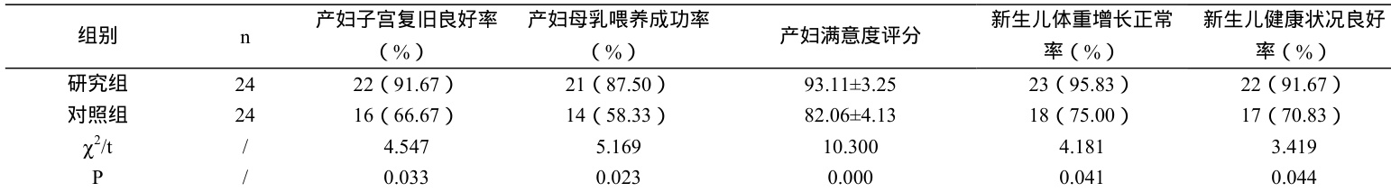 护理后,两组产妇子宫复旧情况良好率、母乳喂养成功率、满意度评分,新生儿体重增长正常率、健康状况良好率对比, P<0.05 ,见表1: