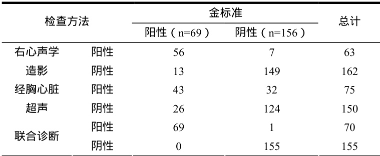 右心声学造影检查的灵敏度 81.16% (56/69)、特异度 95.51% (149/156)、准确度 91.11% (205/255);经胸心脏超声检查的灵敏度 62.32% ( 43/6 9)、特异度 79.49% (124/156)、准确度 74.22% (167/255);联合诊断的灵敏度 100.00% (69/69)、特异度 99.36% (155/156)、准确度 99.56% ( 224/2 55)。