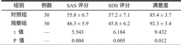 在本研究中,观察组护理后 SAS、SDS 评分低于对照组,满意度高于对照组(