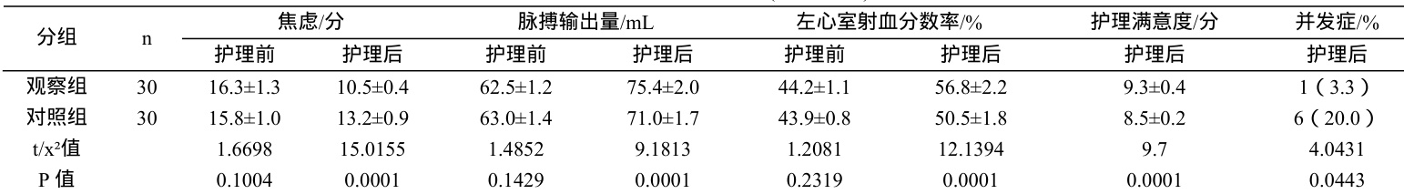 观察组与对照组护理前临床各指标对比差异较小( P>0.05⋅ );两组护理后对比,观察组患者的焦虑情绪及心功能改善效果均优于对照组,并发症发生率低于对照组,对护理的满意度评分高于对照组, (P<0.05) ,如表 1
