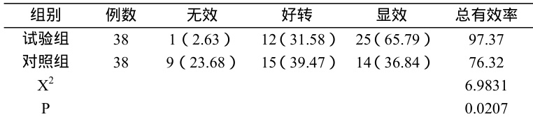 表1 内的疗效评定结果:试验组高于对照组( P<0.05 )。