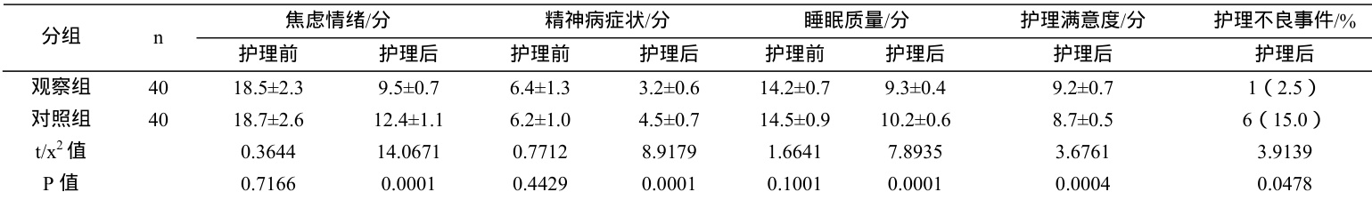 护理前,组间临床指标对比存在的差异较小( P>0.05 );护理后,观察组患者的焦虑情绪、精神病症状及睡眠质量改善程度均优于对照组,护理不良事件发生率低于对照组,护理满意度评分高于对照组, (P<0.05) ,如表 1