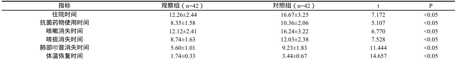 本研究结果说明BAL 辅助治疗效果显著,分析原因:支BAL 直接清除气管、支气管及病灶处黏性/脓性分泌物,减少细菌定植,降低感染负荷,缩短抗菌药物使用时间。分泌物清除后,气道阻塞缓解,通气功能改善,促进咳嗽、咳痰、肺部啰音消失,加速体温恢复[3]。灌洗减轻气道阻塞和炎症分泌物对肺组织的刺激,降低炎症反应,改善肺换气功能,使血气指标(如氧分压、二氧化碳分压)及炎症指标好转。整体呼吸功能与感染控制改善,减少病情迁延,缩短住院时间,优化转归。