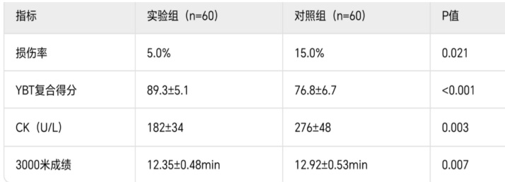 - 损伤发生率(采用 NIH 标准)- Y 平衡测试动态稳定性- 血清 CK、Myoglobin 水平- 3000 米跑成绩提升幅度