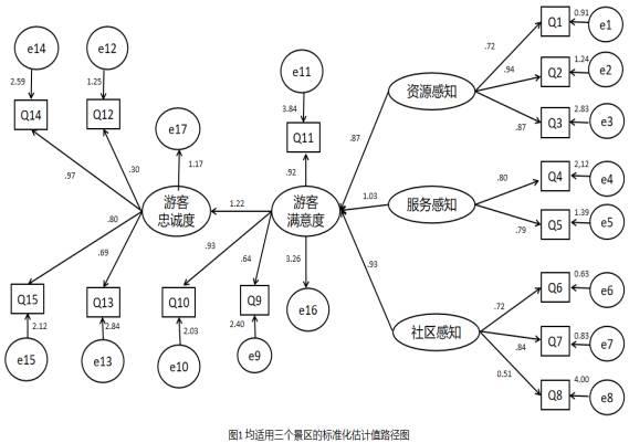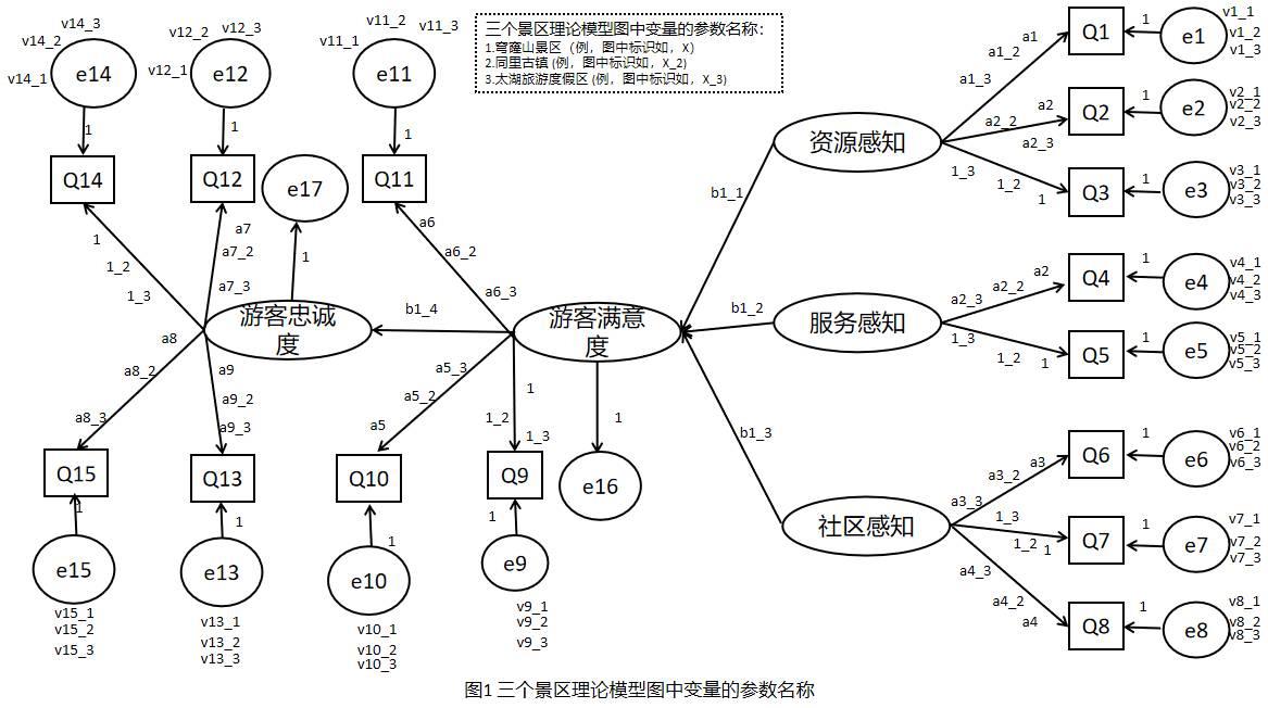 在一个视障游客的资源感知、社区感知与服务感知对游客满意度、忠诚度影响的因果模型研究中,本文提出以下关于视障游客在三个景区的因果模型图,如图1。Amos根据这3个理论模型图提供了5个内定的参数限制模型:①模型1:设定测量系数相等;②模型2:增列结构系数相等;③模型3:增列结构协方差相等;④模型4:增列结构残差相等; ⑤ 模型5:增列测量残差相等。最后通过AMOS24.0进行运算和拟合,结果显示只有模型5(最严格限制模型)可以估计,其余模型的理论模型均无法估计。