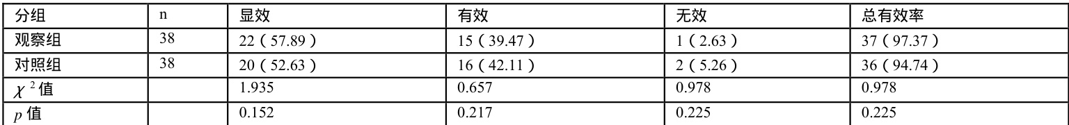 观察组治疗总有效率 97.37% ,与对照组 94.74% 相比差异小( P>0.05)
