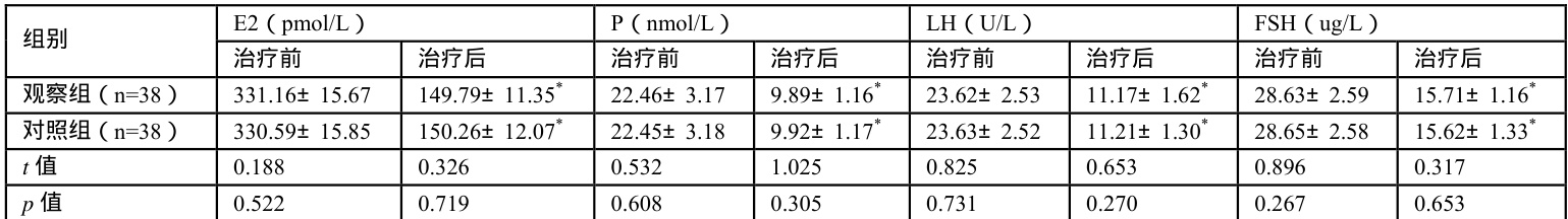 E2、P、LH、FSH 均下降且低于治疗前( P<0.05 ),治疗后两组的E2、P、P>0.05 )。