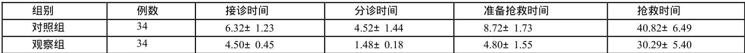抢救时间以接诊时间、分诊时间、准备抢救时间、抢救时间几项为主,经过分析,可看出观察组相较于对照组更短( ρP<0.05 )。数据如下。