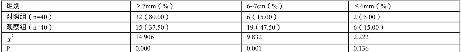 结果显示,两组 >7mm. 、 6~7mm 占比对比差异具有统计学意义,P<0.05