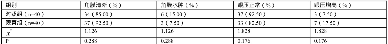 结果显示,两组角膜清晰占比、角膜水肿占比、眼压正常占比、眼压