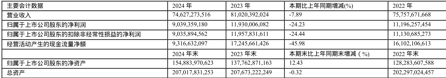 销售净利率:2024 年公司营业收入为 746.27 亿元,同比下降 7.89% ,净利润为90.39 亿元,同比下降 24.23% ,净利率为 13.77% ,较上年同期下降2.97 个百分点。这表明公司在控制成本和费用方面可能存在一定问题,导致净利润下降幅度大于营业收入下降幅度,主营获利能力削弱。