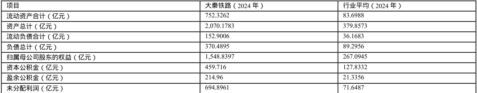 大秦铁路的各项指标均显著高于行业平均水平,特别是在资产规模和股东权益方面,体现出其在铁路运输行业的领先地位。