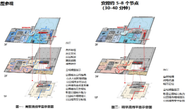 流线设计是规划展览馆室内设计的关键环节。合理的流线设计能够引导观众按照展示的逻辑顺序进行参观,避免重复和混乱。一般而言,规划展览馆的流线设计可采用线性流线、环形流线或者混合流线等形式。线性流线适用于展示内容具有明确时间顺序或逻辑关系的展览馆;环形流线让观众在参观过程中能够自由选择参观路线,形成循环的参观路径,增加参观的灵活性和趣味性;混合流线则结合了线性流线和环形流线的特点,根据展示内容的不同进行合理组合。以成都规划展览馆为例,设置了政商的 VIP 流线和普通民众参观的流线。在设计过程中,充分考虑了不同人群的参观需求和时间安排,普通民众流线丰富全面(图一),确保 VIP 流线高效便捷(图二),提升了整体参观体验。