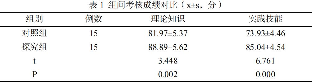 探究组的理论知识及实践技能成绩均高于对照组,差异具有统计学意义(P<0.05),见表 1。