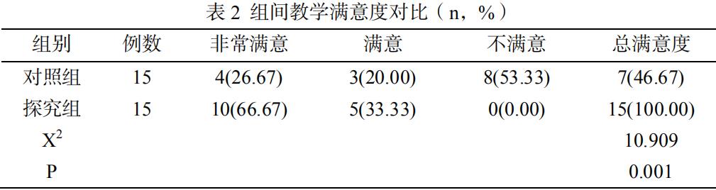 (2)教学满意度:采用问卷调查的方式对两组见习教学法进行满意度调查,评价内容包括:学习兴趣、理解能力、教师引导力、知识记忆力等,分为非常满意、满意、不满意。总满意度=(非常满意+满意)/总人数×100.00%