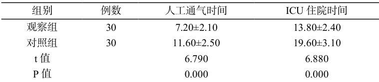 观察组患者的人工通气时间以及 ICU 住院时间均低于对照组患者(P<0.05),具体情况见表 1。
