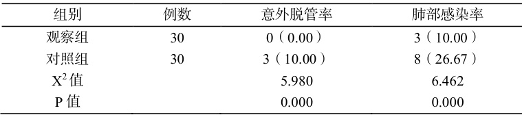 观察组患者出现意外脱管以及肺部感染的几率显著小于对照组患者((P<0.05),具体情况见表 2。