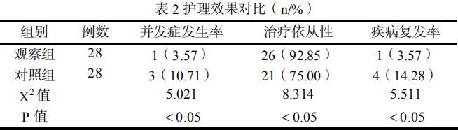 据统计数据看,观察组并发症发生率、治疗依从性及疾病复发率均优于对照组(P<0.05)。
