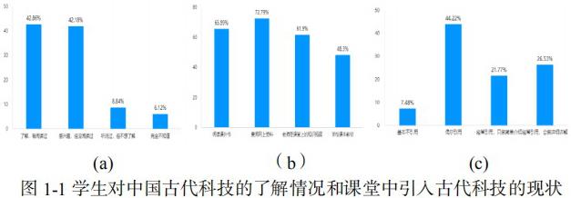学生对古代科技著作的了解程度(图 1-1a):42.86%的学生了解并阅读过,42.18%的学生对此感兴趣但没阅读过,不想了解和完全不知道的学生占比 14.96%。学生了解古代科技的途径(图 1-1b):主要有查阅网上资料占 72.79%、阅读课外书占 65.99%、老师在课堂上的知识点拓展占 61.9%。专业课教师在课堂引用古代科技的情况(图 1-1c):基本不引用的比例仅为7.48%、偶尔引用的比例为 44.22%、经常引用只做简单介绍的占 21.77%、经常引用并详细讲解的比例为 26.53%。