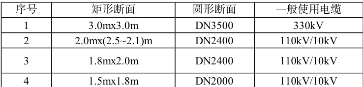 电缆隧道通常有矩形断面和圆形断面两种,两种断面之间的替换以电缆支架、沟槽设置规格数量为标准,保证容量相同的原则,一般可参照下表,表 1.1 电力隧道矩形圆形断面替换参照表