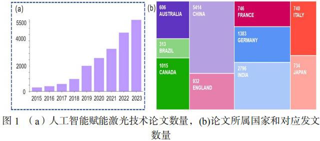 近些年,以激光技术为基础的光电子产业快速发展,被广泛地应用于科学研究、医疗、先进制造、国防等领域[1]。随着人工智能技术的飞速发展,作为一项赋能技术已全面系统进一步带动激光技术的快速发展,在激光系统优化设计[2、3]、光束控制[4、5]以及特性表征[6、7]等方面取得了良好的应用效果。在 Web of Science 上对题目和主题同时包含关键词“laser”和 AI 算法相关词汇(包括“machine learning”“artificial intelligence”“neuralnetwork”“deep learning”“reinforcement learning”等)的论文进行了检索和分析,发现在 2015 年以后发文量呈快速上升趋势,在 2023 年发文量高达约6000 篇;并且我国在人工智能赋能激光技术上处于领先状态,如图 1 所示。