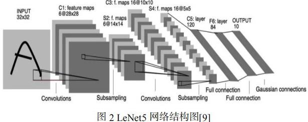 由于参与该实验课程的大部分同学都没有接受过系统的神经网络相关知识学习,并且针对课程提出的模式识别是基于仿真数据,也不需要考虑多模式分解的情况,课程中以比较经典的 Lenet 网络结构作为例子进行讲解。Lenet 包括 Lenet1 - Lenet5 网络结构,由 Yann LeCun 等人在 1990 年中提出[8]。LeNet 首次采用了卷积层、池化层这两个全新的神经网络组件,以实现手写字母高准确率的识别。其中 LeNet5 网络结构识别效果最好,其网络结构如图 2 所示,包含了 3 层卷积层,2 层池化层,2 层全连接层。