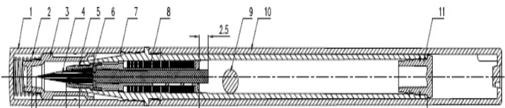 眼线液笔作为一种精密液态眼线工具,其笔状设计结合精细刷头或海绵头,能够快速勾勒出清晰的眼线效果。这种化妆工具的包材系统是一个复杂的工程组件,主要由1.盖 2.弹簧3.内套 4.笔头5.刷套 6.引水芯7.刷套座 8.储液和控液系统9.钢柱10.底 11.塞等功能组件构成(图1)。经过市场调研发现,这些包材组件主要采用合成塑料制造,包括聚丙烯(PP)、丙烯腈-丁二烯-苯乙烯共聚物(ABS)、聚对苯二甲酸乙二醇酯(PET)和聚氨酯(PU)等[1]。这些高分子材料的选择直接影响到产品的使用性能和产品稳定性。