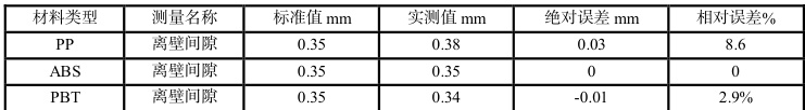 按照测量方法对 PP、ABS、PBT 三种材料组件同坐标位置[X:6.064,Y:5.328,Z:0.000] 进行间隙测量,每个位置测量2 次,取均值为实测值,测量结果如表5 所示,测量的平均值进行对比, 计算绝对误差和相对误差,分析得出变形程度PP 材料>PBT 材料