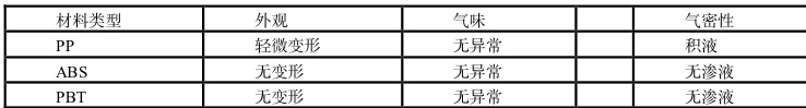 将PP、ABS、PBT 三种材料注塑成型为包装容器,待充分冷却后,将容器在高低温交变气候试验箱中进行,高低温循环3 次后,在标准光源下检查产品外观、气味、气密性的结果详见表4。