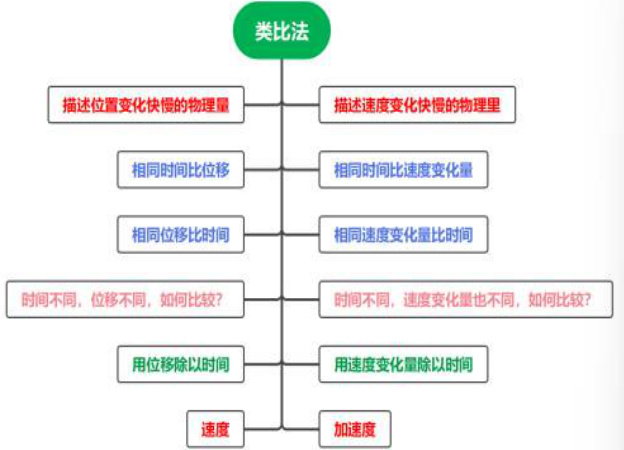 以“加速度”的相关内容讲解为例,在具体教学时,教师可指导学生通过类比法学习,即在对两个物体的位置快慢变化进行比较时,可以让学生基于两方面实施对比:同个时间,类比位移;相同位移,类比时间。因此,在对加速度概念进行讲解时,也可基于这两方面,指导学生猜测,首先,让学生猜测速度的快慢变化要怎样比较,学生在学习过速度后,就能通过速度变化、时间两个方面进行类比;其次,教师可深入引导,让学生依据速度的定义,对速度变化量除以时间实施类比,以深化学生对于加速度的理解。由此可知,通过类比法,不仅能帮助学生很好的理解新学习的物理观念,而且还能通过思维地图进行展示,如图,以促进其物理观念发展。
