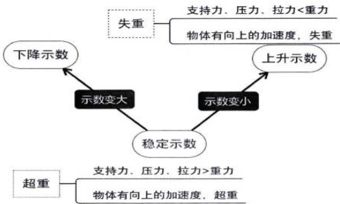 以“超重和失重”的相关内容讲解为例,由于地球引力造成的影响,学生仅依赖教师的理论讲述,是无法理解与掌握超重和失重的相关概念的,此时,教师可提前准备电子秤,让学生站到电子秤称重,记录称出的数据,然后在电子秤上蹲下,对电子秤上的数字变化进行观察,并加以记录,且标注好是下蹲的数据。接着,通过思维地图,将学生起身时,电子秤数据的变化进行记录,以此让学生切身体会到超重与失重过程重力的变化,深入探究出超重与失重形成的所需的条件(如图 3),从而使学生深度理解超重与失重的相关内容,并形成相应的科学探究力。