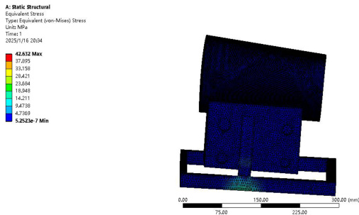 如图 2.3 柴油机模型等效应力图所示,柴油机的最大等效应力集中在支撑底部,数值为 42.632