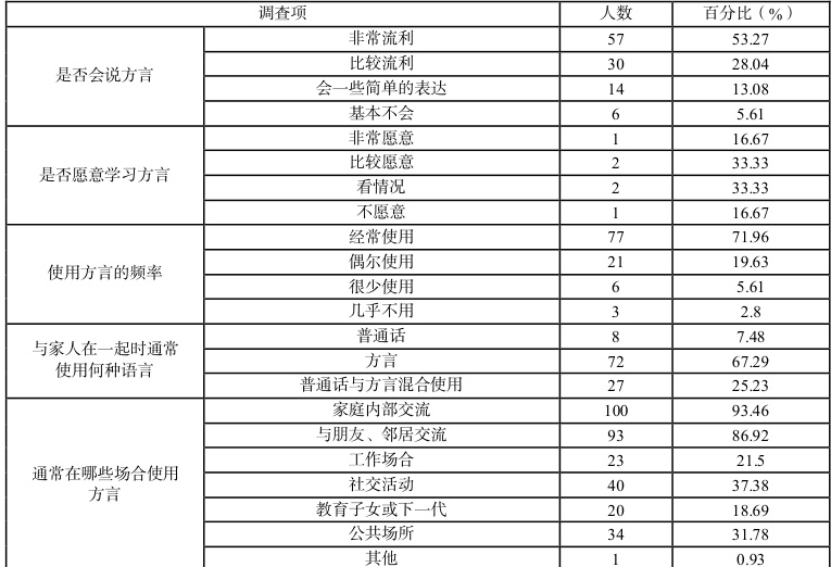 据调查研究,超半数的人能够使用方言,并且使用的场景主要集中在家庭及当地的社区当中,并不会将方言使用在社交以及教育当中。但不会使用方言的人相比较之下对学习使用方言的意愿较低,这反映出绝大多数会说方言的人使用方言的场景以及范围有限,仅限于小范围使用。对于不会说方言的人来说,即使不会方言但学习方言的意愿也较低,可能是由于方言是适用场景有限或者方言观念不够深入。从中可以看出方言对于年轻一代来说是逐渐被淘汰及被普通话取代的。