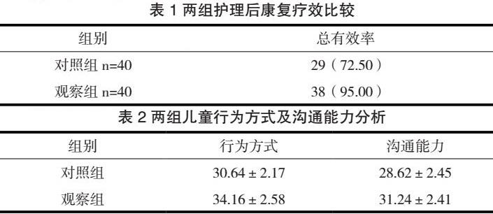 护理后,观察组儿童的行为方式、沟通能力得分较对照组显著提高,(P<0.05)。见表2。
