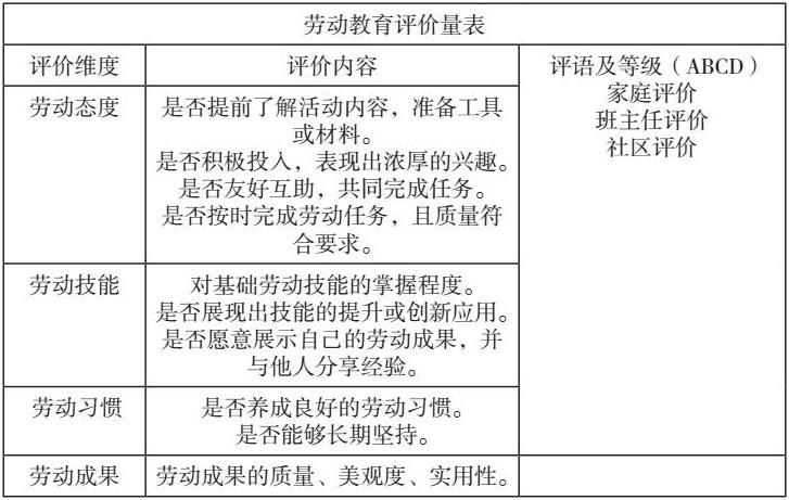 遵循《大中小学劳动教育指导纲要(试行)》,劳动素养已被确立为学生综合素质评价体系的关键构成部分。因此,班主任密切关注学生在劳动教育活动中的具体表现,设计评价量表,并确立劳动积分记录机制,以此来评价学生的劳动态度、劳动习惯和劳动能力。通过实施学生自我评价、同伴间相互评价、教师评价等多维度评价方法,教师对学生劳动教育进行全方位的综合评价,并结合家庭评价、社区评价,将评价结果归入学生个人档案。
