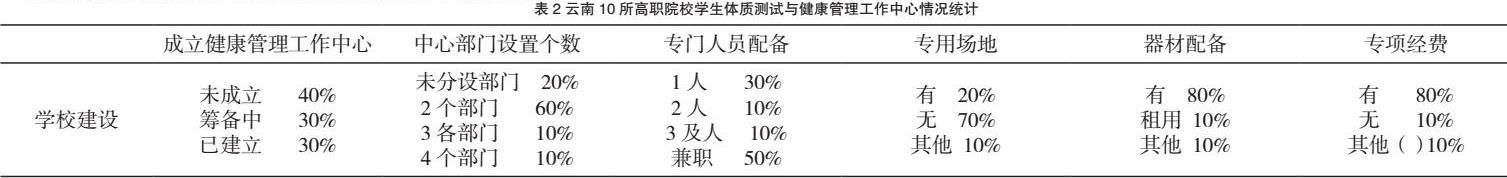 运行实体作为高职院校学生体质健康管理模式的专业化支撑体系,通过独立健康管理服务中心建设、专职人员配备及专项场地设施投入,实现健康服务资源整合、职能边界明晰与服务质量标准化,其完备程度直接决定政策工具的执行效能与可持续发展能力[7]。专门学生体质健康促进与管理工作机构的建设现状折射出高职院校对体质健康管理的认知层级,云南高职院校中,仅30%的院校成立独立健康管理服务中心,但其中60%的中心挂靠体育部,实质上仍属体育教学体系的附属机构(见表2)。这种“学科本位”的机构设置,导致健康管理服务的专业性与独立性不足。从人力资源配置看,专职人员占比仅40%,且70%的专职人员兼任其他职务,形成“一人多岗”的超负荷运转格局;兼职人员占比60%,其专业背景多样性不足,难以支撑心理健康服务、运动损伤预防等延伸职能。