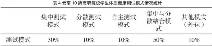 流程标准作为高职院校学生体质健康管理模式的质量控制中枢,通过规范测试流程、明确操作准则及建立动态质控体系,实现健康管理服务的标准化供给与精准化实施,其科学性与严谨性直接决定政策工具的执行效度与健康干预的可持续性[9]。且不同的测试模式的选择直接反映院校的管理理念与资源禀赋。数据显示,50%的院校采用“集中与分散相结合”模式,通过信息化平台实现测试时段弹性化与场地共享(见表4),这种模式使测试效率提升40%,学生参与率提高25%。但需要警惕的是,30%的院校依赖外包测试模式,将质量控制权转移给社会机构,导致15%的院校出现数据异常(如体测成绩虚高)的监管风险。