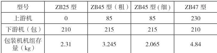 (五)包装机机组存量包装机有 ZB25、ZB45、ZB47 三种型号,小组成员现场计数自然停车状态下的包装机存量,根据烟支单重确定不同牌号状态下的包装机内储烟量。
