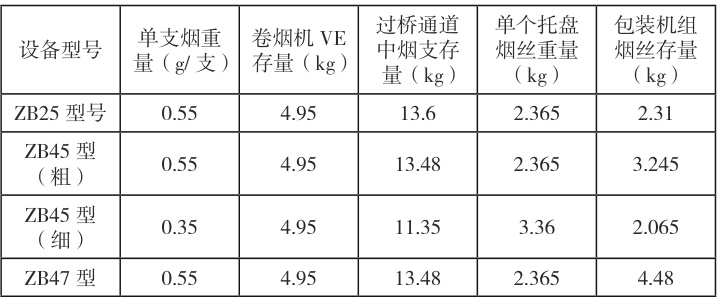 经调查,ZJ17 和 ZJ112 型号卷烟机在风力送丝无烟丝时,VE 剩余储量相近。选择两种型号卷烟机进行余量记录和排空试验,计算得出卷烟机VE 存量约为